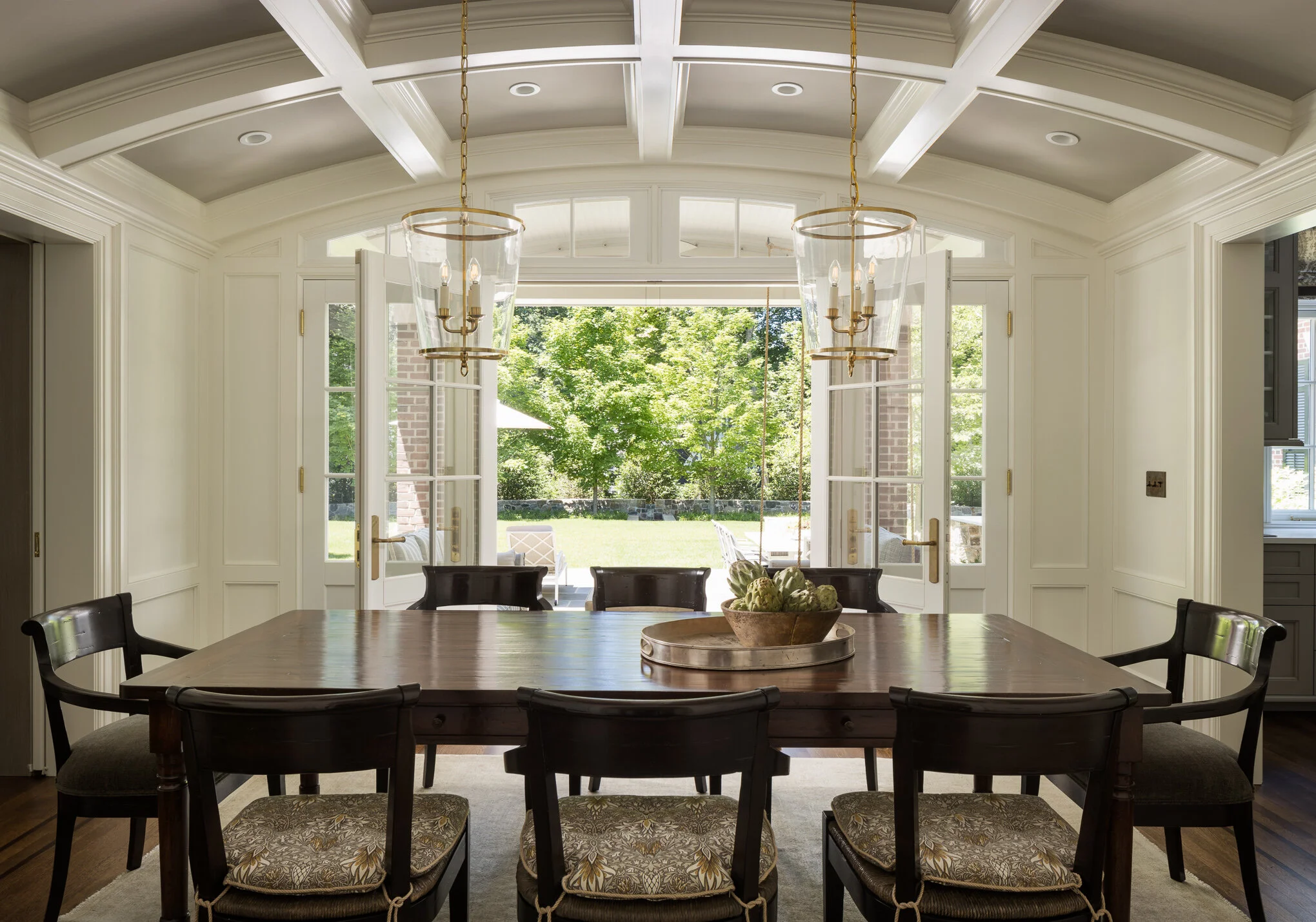 On the south side is the cutting garden where bluestone is carefully set in a pattern creating diamond shaped lawn panels with lush perennial borders. In the spring, the garden overflows with daffodils and tulips creating a stunning visual display viewed from the adjacent sun room and nearby pavilion. The west end of the garden is the pavilion with several architectural details designed by Rosen Kelly Conway Architecture & Design. The structure serves as the place to relax in front of the fireplace and view the surrounding rear yard landscape. An expansive lawn surrounds the space with the space defined by a gently curving wall with fountain. The granite and bluestone fountain is viewed from all areas and is the focal point from the kitchen, breakfast area and rear patio. Glimpses can be caught as you enter the front door and look through the home. A stone kitchen island anchors the patio space in front the hydrangea drenched and brick and limestone clad garage structure. Sugar maples with an under planting of liriope spicata and spring bulbs follow the gently curving stone wall with holly trees below the wall creating the dark green backdrop that provides privacy from the neighbor’s behind. On the north side of the property is the motor court. The ground plane is carefully designed pattern of concrete panels with exposed decorative cobbles. Reclaimed granite blocks in rows line the space and driveway to the street.